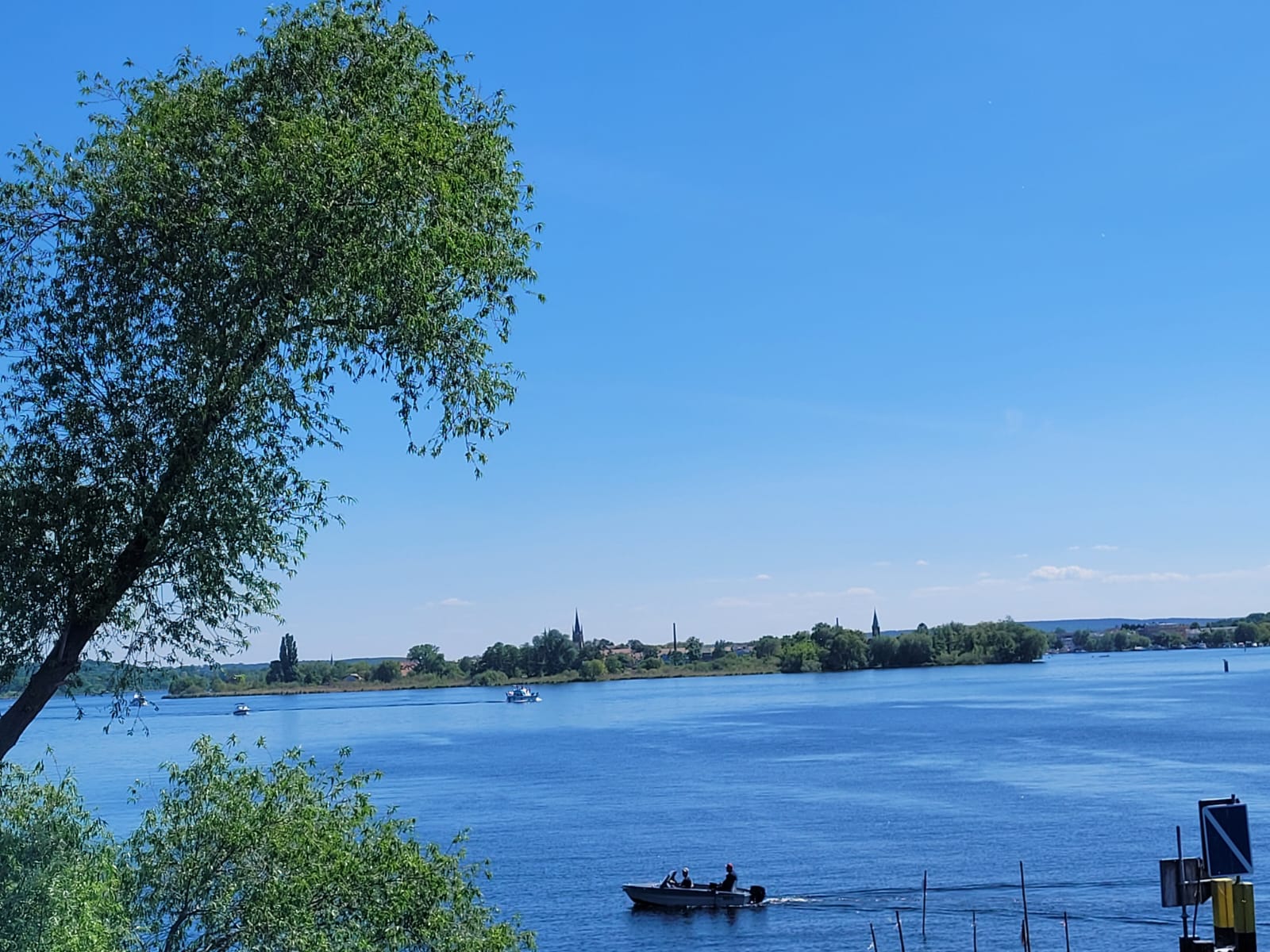 Weiter ging es in Richtung Geltow, aber bei Baumgartenbrück bogen wir ab und fuhren über die Brücke der B1/ Berliner Chaussee bis zum Abzweig Potsdamer Str., die uns nach Werder hineinführte. Immer an der Havel entlang kamen wir zur Straße „Unter den Linden“, die zu diesem Zeitpunkt schon sehr belebt war und auf eine kleine Brücke über einen Arm der Havel zur Insel Werder und ihrer sehenswerten Altstadt führte. Bis vor kurzem tobte hier noch das Werderaner Baumblütenfest, aber auch ohne Buden und Riesenrad war die sonst sehr ruhige Altstadt fröhlich von den vielen Ausflugsgruppen belebt. Wir mitten mang, durch die Altstadtgassen auf die andere Havelseite der Insel, dann die Promenade entlang zu dem bekannten und beliebten Fischrestaurant und Ausflugslokal „Arielle“.