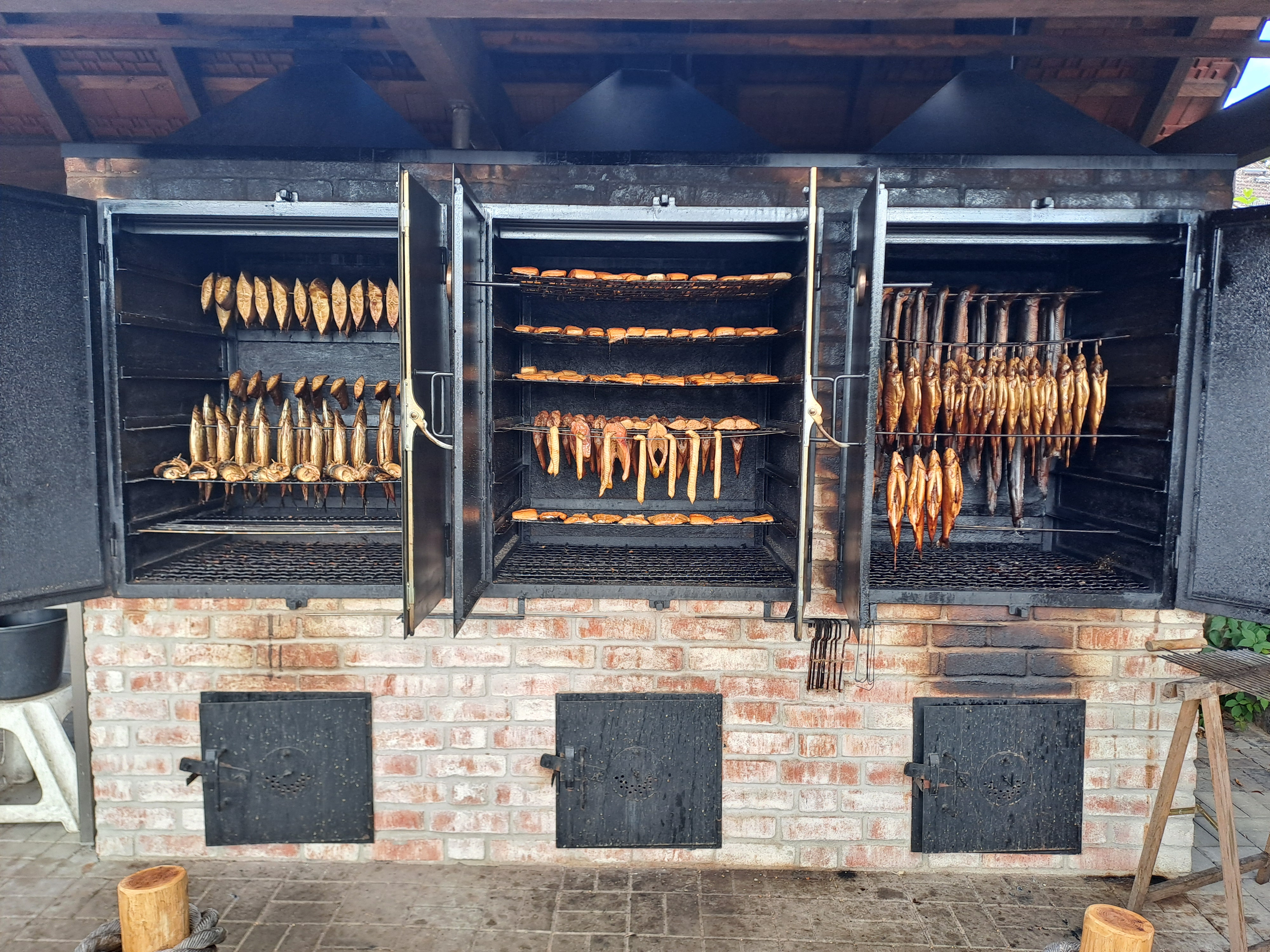 Auf der anderen Seite angekommen, entschlossen wir uns spontan den einzigen Müggelseefischer und die von ihm betriebene Fischgaststätte zu besuchen. Über eine holprige Dorfstr. ging es dann zum Ufer der Müggelspree und zur Fischerei. Da war mächtig Betrieb, voll besetzter Gastgarten und es roch verdammt lecker nach dem Räucherfisch, der in mehreren Räucherkammern offen fertig präsentiert wurde, Makrele und Aal wurden gekauft und packten wir ein, Fischbrötchen wurde an Ort und Stelle verzehrt. Sehr empfehlenswert, wer frischen Fisch, geräuchert oder eingelegt, mag.