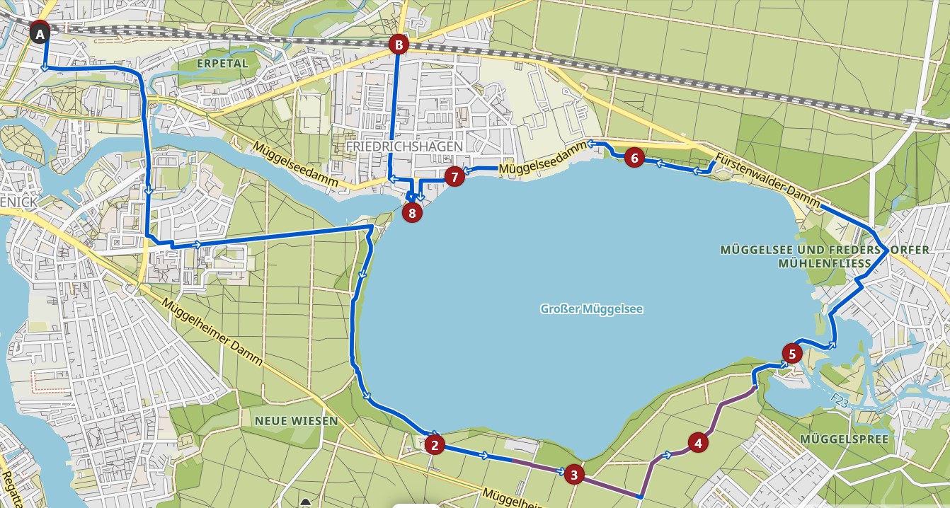 Von S-Bhf. fuhren wir zur Salvador-Allende-Brücke über die Müggelspree. Weiter ging es zum Müggelschlößchenweg. Auf ihm ging es durch den Forst und weiter zur Müggelseepromenade. An der Mündung der Müggelspree trafen wir dann auf den Müggelsee.