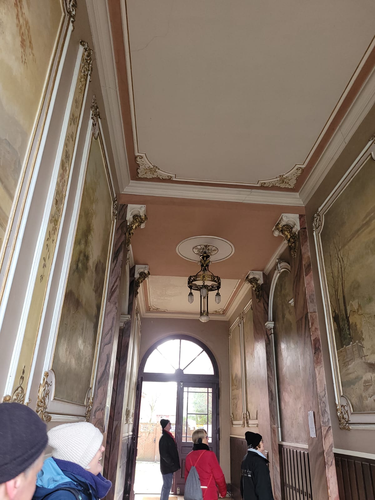 Wir trafen uns auf dem Hoffmann-von-Fallersleben-Platz, vor der russisch-orthodoxen Kirche, in Wilmersdorf. Von dort aus ging es durch einen kleinen Siedlungsweg zur Rudolstädter Str., zum großen Wilmersdorfer Friedhof, an dessen Südseite wir entlang liefen. Am Ende des Friedhofs erreichten wir den Fennsee. Auf seinem Uferweg ging es zum Friedrich-Ebert-Gymnasium an der Blissestr. Über ein kleines Stück der Blissestr. erreichten wir den Beginn der Wilhelmsaue. Damit waren wir im ältesten Teil Wilmersdorf angekommen, "Alt-Wilmersdorf". Zufällig konnten wir dort in einem mächtigen Hauseingang eines Jahrundertwendehauses blicken, an dessen Wänden Malereien mit Motiven des Dorfes Wilmersdorf zu sehen sind.