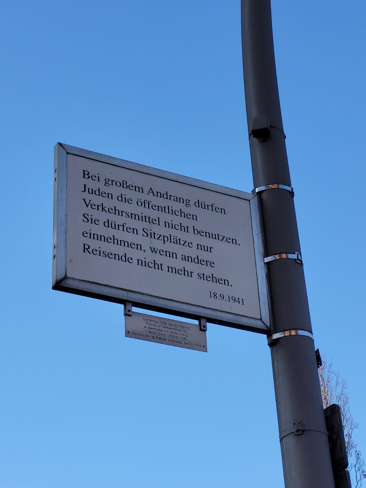 Unterwegs lernten wir, dass das sog. "Bayersichen Viertel" bis zur Nazizeit auch "jüdische Schweiz" genannt wurde, weil hier viele prominente Künstler, Schriftsteller, Schauspieler und Literaten jüdischen Glaubens wohnten. Mit einem Denkmalprojekt „Orte des Erinnerns“ weist eine Freiluftausstellung mit Texttafeln an Laternenpfählen auf die Nürnberger Rassengesetze von 1935 hin. Auf jeder Tafel ist eine Diskriminierungs- und Ausgrenzungsverordnung zu lesen, die das Leben von Juden unerträglich machen sollte. Sehr eindrucksvoll für uns.