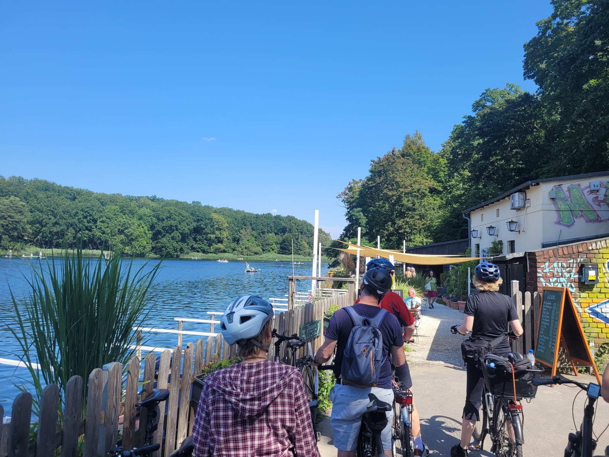 Allerdings war es entlang des Schlachtensees brechend voll, tausende Berliner und vor allem wohl auch Touristen sonnten sich an den Ufern und Hängen und badeten oder fuhren in Holz- und Gummibooten, Stand-Up Paddle Boards und anderen schwimmenden Geräten auf dem See. Schließlich erreichten wir das Restaurant „Fischerhütte am Schlachtensee“ mit großem Biergarten direkt am See. Dort kehrten wir nach insgesamt 36 km zur abschließenden Rast ein, bevor es dann noch eine kurze Strecke weiter über die Fischerhüttenstr. zum U-Bahnhof Krumme Lanke und zur Heimfahrt ging. Es war eine schöne und abwechslungsreiche Tour, ein paar Steigungen aber vor allem viel durch schützenden Wald und am Wasser entlang. Das war dann bei 28 – 30 Grad an dem Tag schon passend. Vielen Dank an Patrick, der den Tourenvorschlag gemacht hatte.