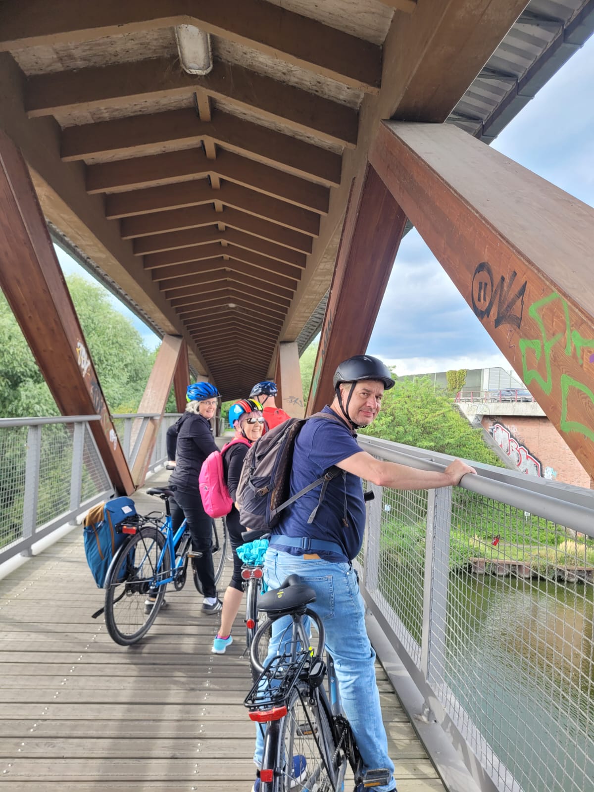 Bevor wir die Autobahn A10 erreichten, bogen wir nach links ab und kamen zur eindrucksvollen Fußgänger- und Radfahrerbrücke über die Dahme in Niederlehme. Am anderen Ufer ging es weiter bis zur Richard-Sorge-Straße und fuhren nach Norden über auf dem uns bereits bekannten Weg zum Bahnhof Wildau.